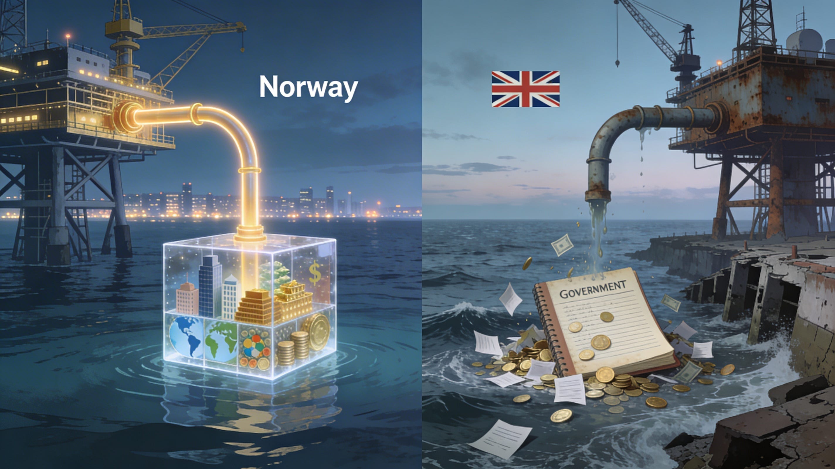 In the late 1960s, two nations discovered they were sitting on one of the most significant hydrocarbon deposits on the planet. The North Sea basin did not discriminate. Norwegian waters and British waters shared the same ancient geology, the same cold grey depths, the same transformative economic potential. Half a century later, one of those nations has a sovereign wealth fund worth over $1.5 trillion — the largest in the world — and now exports gas to the other. That nation imports the gas, cannot fund the maintenance of its own infrastructure, and spent the last decade arguing about whether to issue new licences while its production base quietly collapsed.